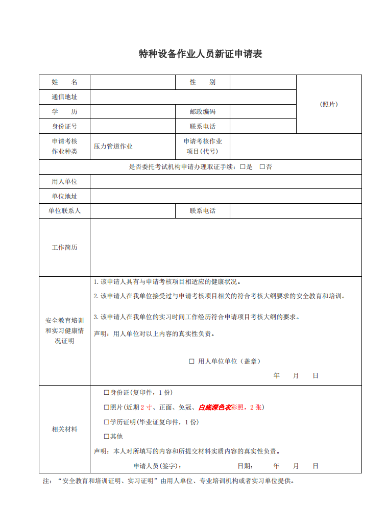 1、參加培訓(xùn)人員如實填寫特種設(shè)備作業(yè)考試申請表1份;
