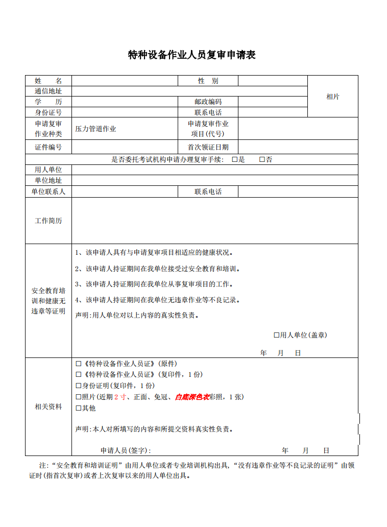1、《特種設(shè)備作業(yè)人員復(fù)審申請》1份