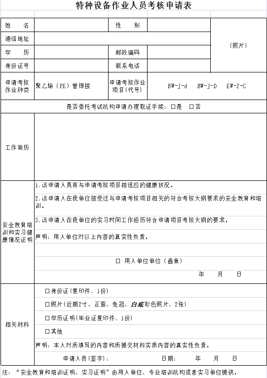 1、參加培訓(xùn)考證人員,請(qǐng)如實(shí)填寫(xiě)特種設(shè)備焊接操作人員考試申請(qǐng)表1份,加蓋單位公章;